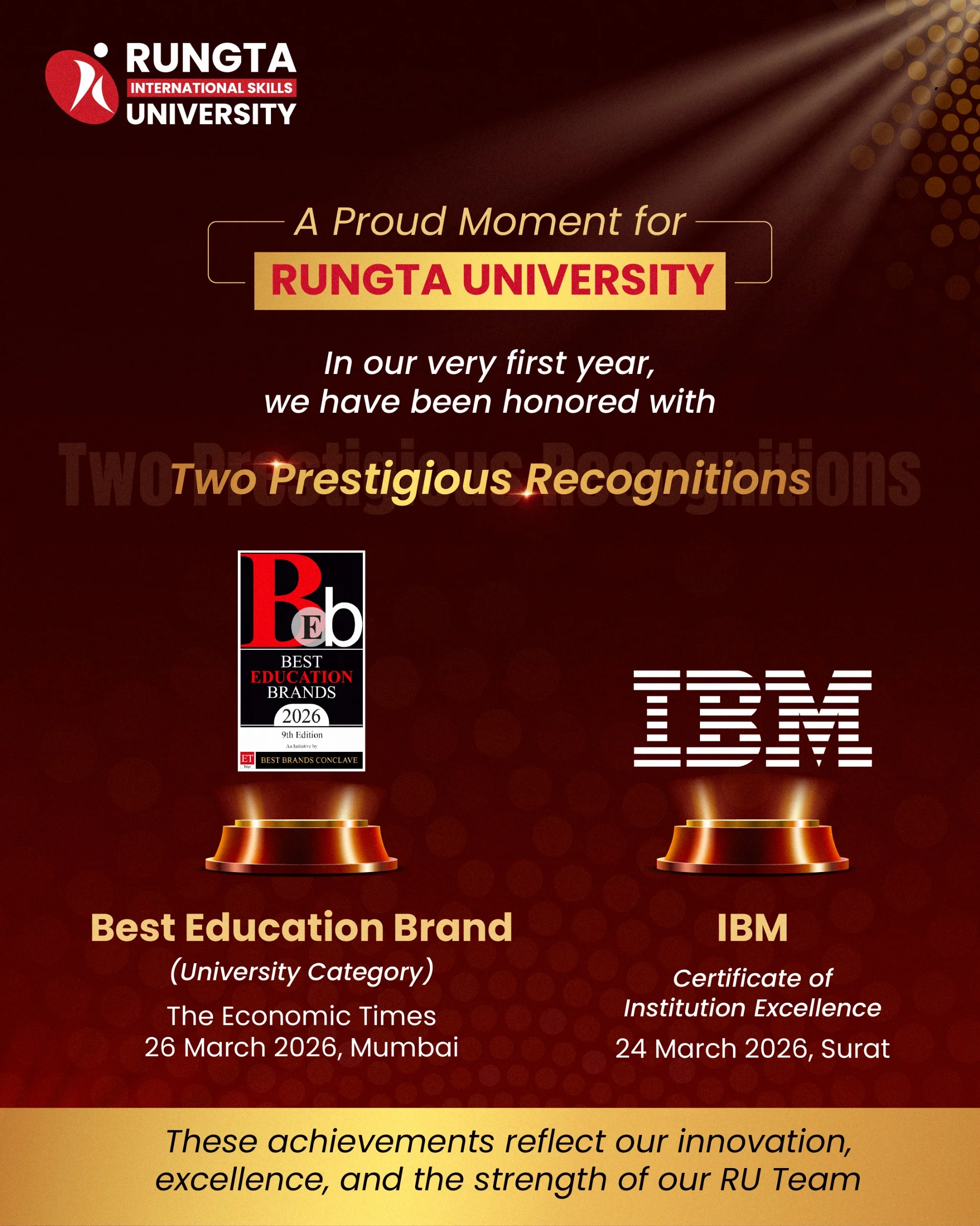 It is a moment of immense pride and celebration for the entire Rungta University community as the institution has been honoured with two prestigious national awards within its very first year of establishment—marking a significant milestone in its journey toward academic excellence.