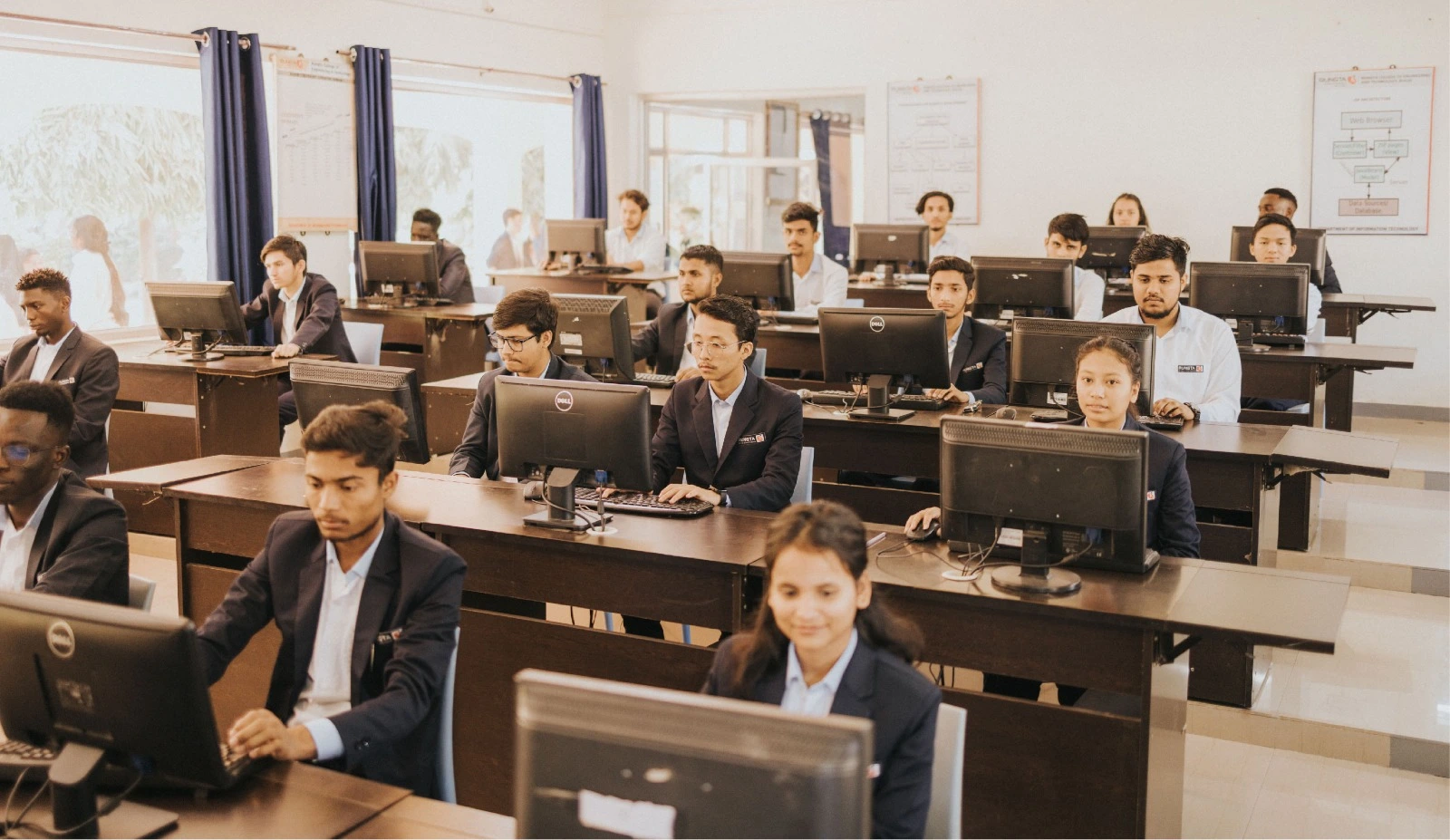 At Rungta International University, technology revolutionizes education with an advanced infrastructure. MPLS VPN Network links all locations, facilitating live classroom transmissions and eLearning solutions via IP Cameras. High-speed Wi-Fi with Omni and Sectoral Antenna covers the campus, offering seamless internet access. With 1 Gbps internet bandwidth from multiple ISPs, students enjoy uninterrupted connectivity. The next-gen IT setup includes smart camera surveillance, lecture recording, and live transmission. Consolidating 60 servers on a virtual platform, alongside 28 TB of EMC NAS/SAN storage, ensures efficient data management. Enterprise-level Cisco switches and Next-Gen firewall appliances enhance network security, while biometric attendance and digital signage streamline operations campus-wide.