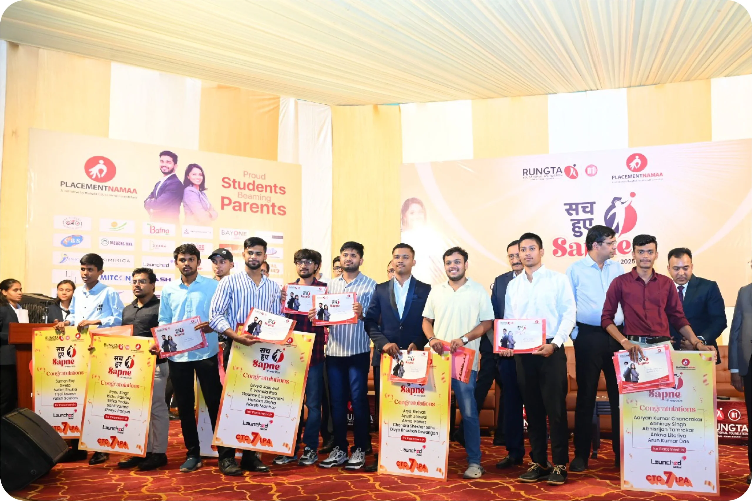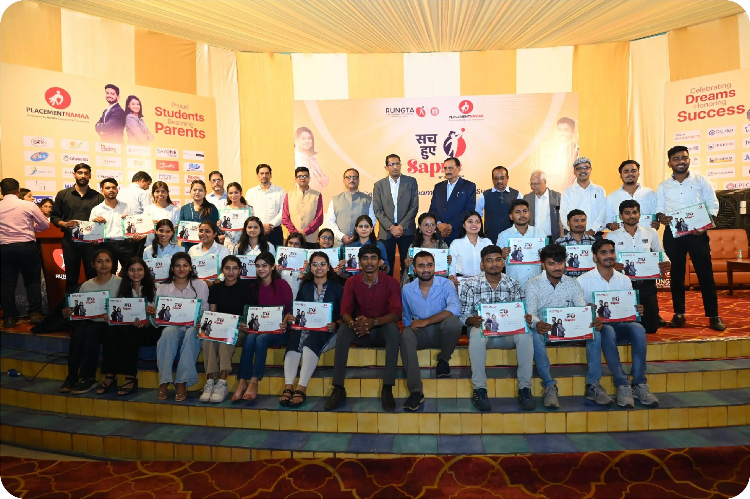 PlacementNamaa, an initiative by Rungta International Skills University under CSR, is a dedicated platform aimed at placing students from Chhattisgarh and Central India into top MNCs. With two core verticals—internship and placement—it bridges the gap between industry and students across Engineering, Management, Pharmacy, Arts, Science, ITI, and Diploma.