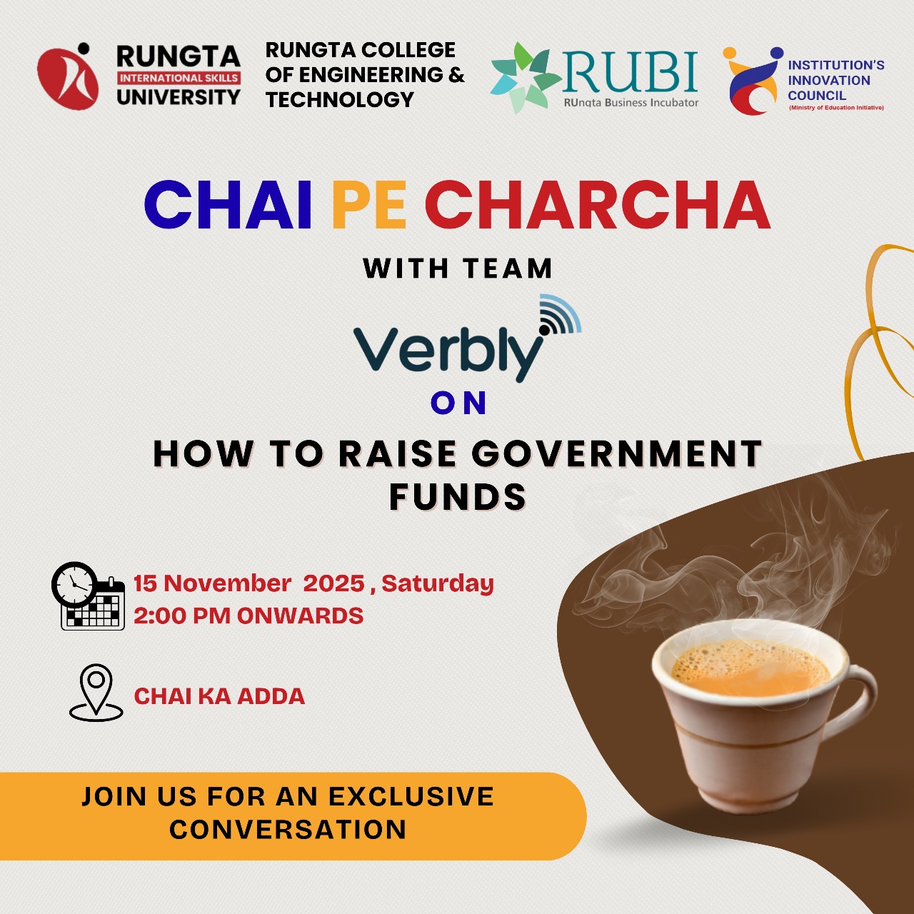 RUBI (Rungta Business Incubator) is hosting an exciting edition of “Chai Pe Charcha”! This time, we have Team Verbly.ai joining us for an exclusive conversation on: 💡 How to Raise Government Funds for Startups & Innovations
