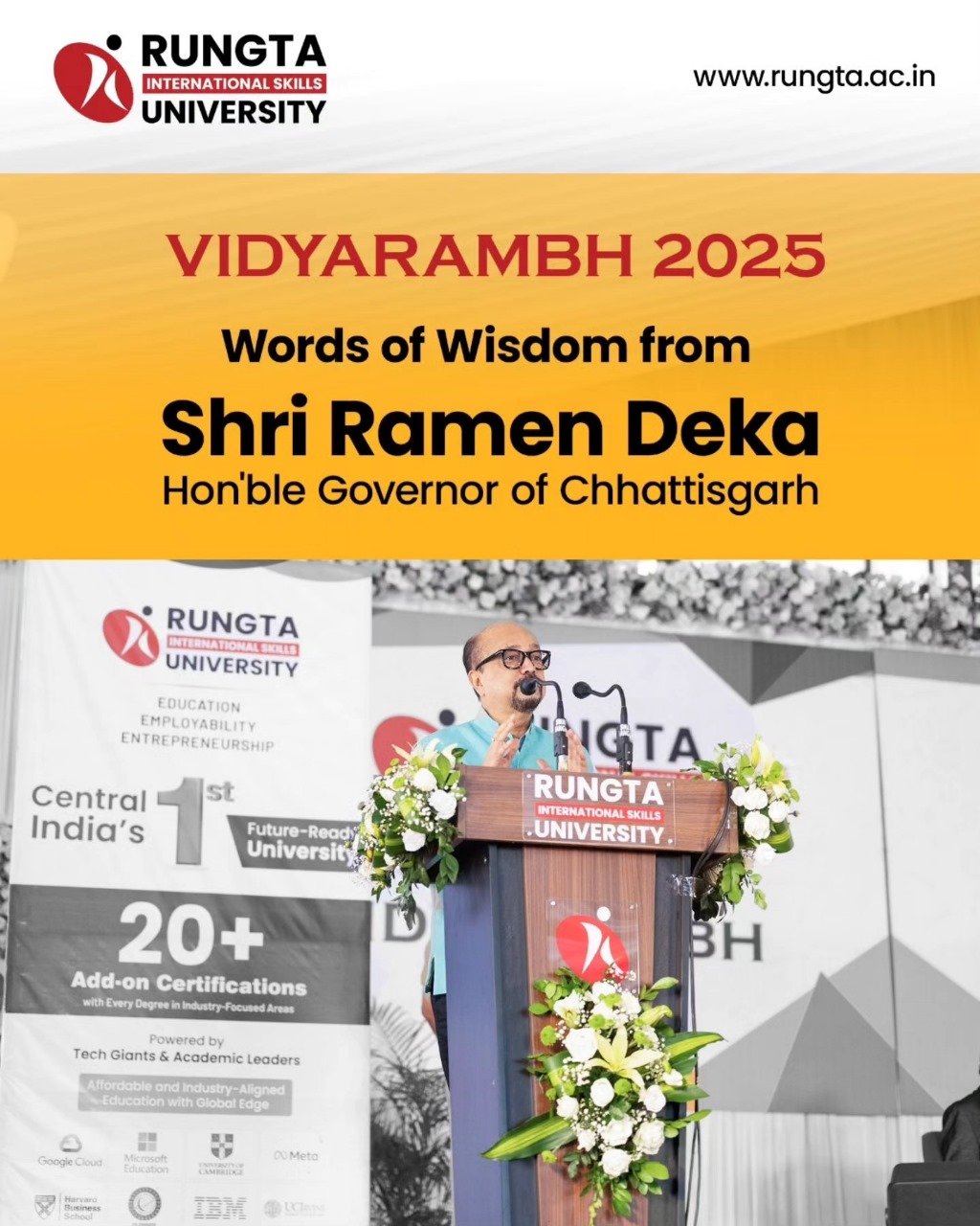 Rungta International Skills University (RIU) was established after 26 years of academic excellence and expertise by the Rungta Group of Institutions. Built on a strong foundation of experience, RIU is committed to nurturing future-ready professionals equipped with in-demand global skills. Our industry-immersive degree programs, aligned with NEP 2020, are designed within a holistic development framework that ensures not only employability but a global outlook.